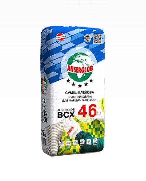 Суміш клейова еластифікована ANSERGLOB BCX 46 для мармур та мозаїки, призначений для внутрішнього і зовнішнього облицювання бетонних, цегляних, цементно-вапняних, цементно-піщаних поверхонь, а також поверхонь, що піддаються періодичним деформаціям (атмосферним впливам і динамічним навантаженням) плитами з мармур та інших світлих порід каменю, а також скляними і мозаїчними плитками і плитками розміром більше ніж 300 х 300 мм Клейова суміш може вікорістовуватіся для облицювання басейнів і резервуарів, підігріваємих і монолітних підлог, експлуатуємих покрівель, терас. Клейова суміш ефективна при облицюванні поверхонь без видалення старої плитки методом «плитка на плитку».