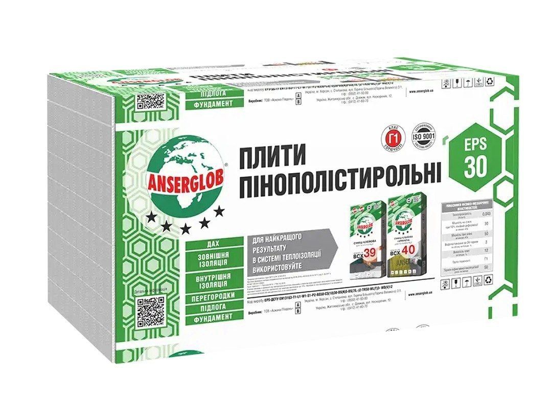 Пінопласт ANSERGLOB ЕPS 30 – спінений полістерол (Expanded PolyStyrene) жорсткий теплоізоляційний матеріал, виготовлений з спученого полістиролу з заповниною повітрям пористою структурою, що має міцність на стиск 30 кПа та щільність – 9 (кг/м3) згідно Європейських техічних умов виробництва пінопласту ДСТУ Б EN 13163:2012.