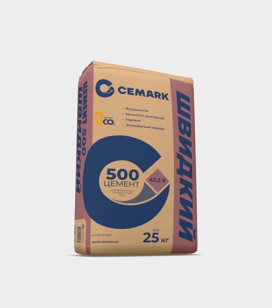 Цемент Cemark Швидкий 500 (Кам’янець-Подільський) 25 кг – портландцемент з прискореним набором міцності, що містить масову частку добавок 20%. Застосовується для робіт, що потребують швидкого набування вискої міцності бетону та підвищені вимоги до морозостійкості (Наприклад: бетонування в холодну пору року, виготовлення архітектурних елементів). Цемент вироблений в м.Камянець-Подільскому, на заводі АТ “Подільський цемент”.